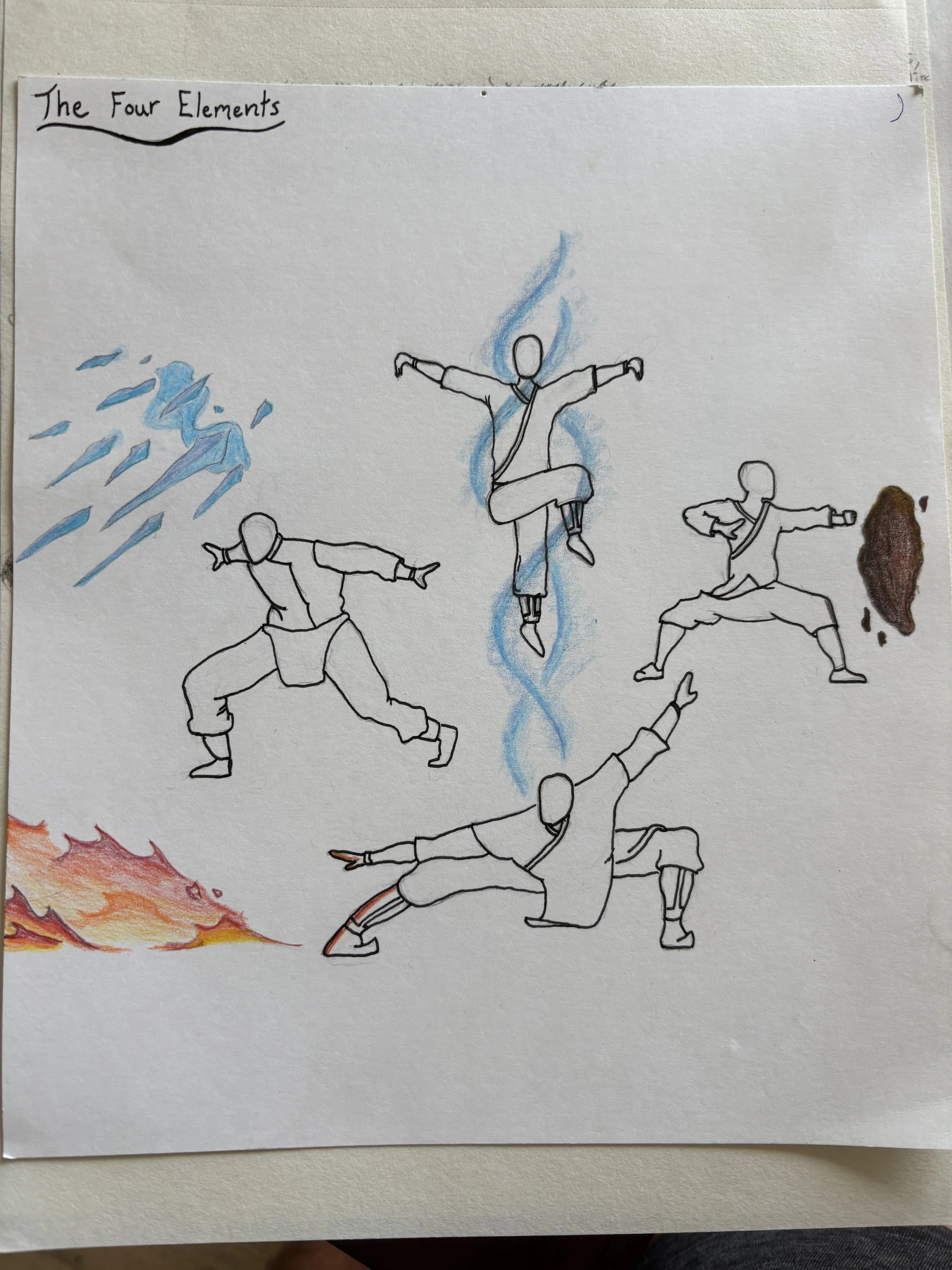 Fire, water, earth, & wind: these are the four elements that are part of the show called Avatar: The Last Airbender. This show inspired me because I’ve practiced mixed martial arts, and I enjoy understanding how these art forms are all connected: Kung Fu, Karate, Jiu Jitsu, Muay Thai, Shaolin…
